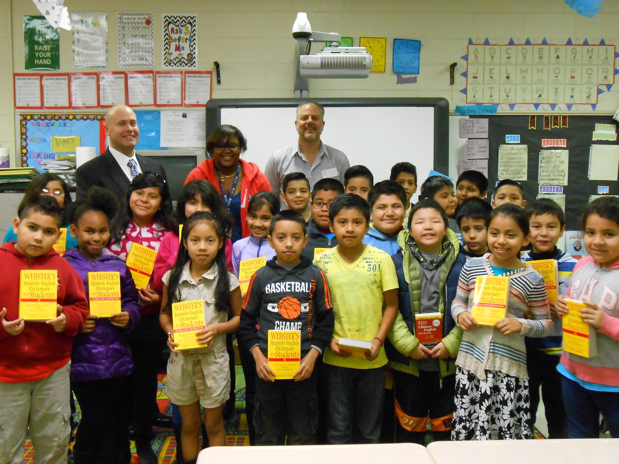 Mrs Anesha James and her 3rd Grade Class at Cary Reynolds Elementary School with Rotarians Joey Heard and Nathan Aberson. Featuring Spanish-English Dictionaries.